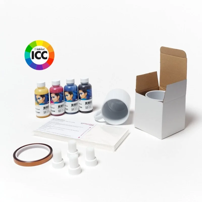 Um kit para sublimar canecas desenvolvido para impressoras Epson EcoTank . Com tintas Sublinova Smart e perfil de cores ICC para materiais rígidos.